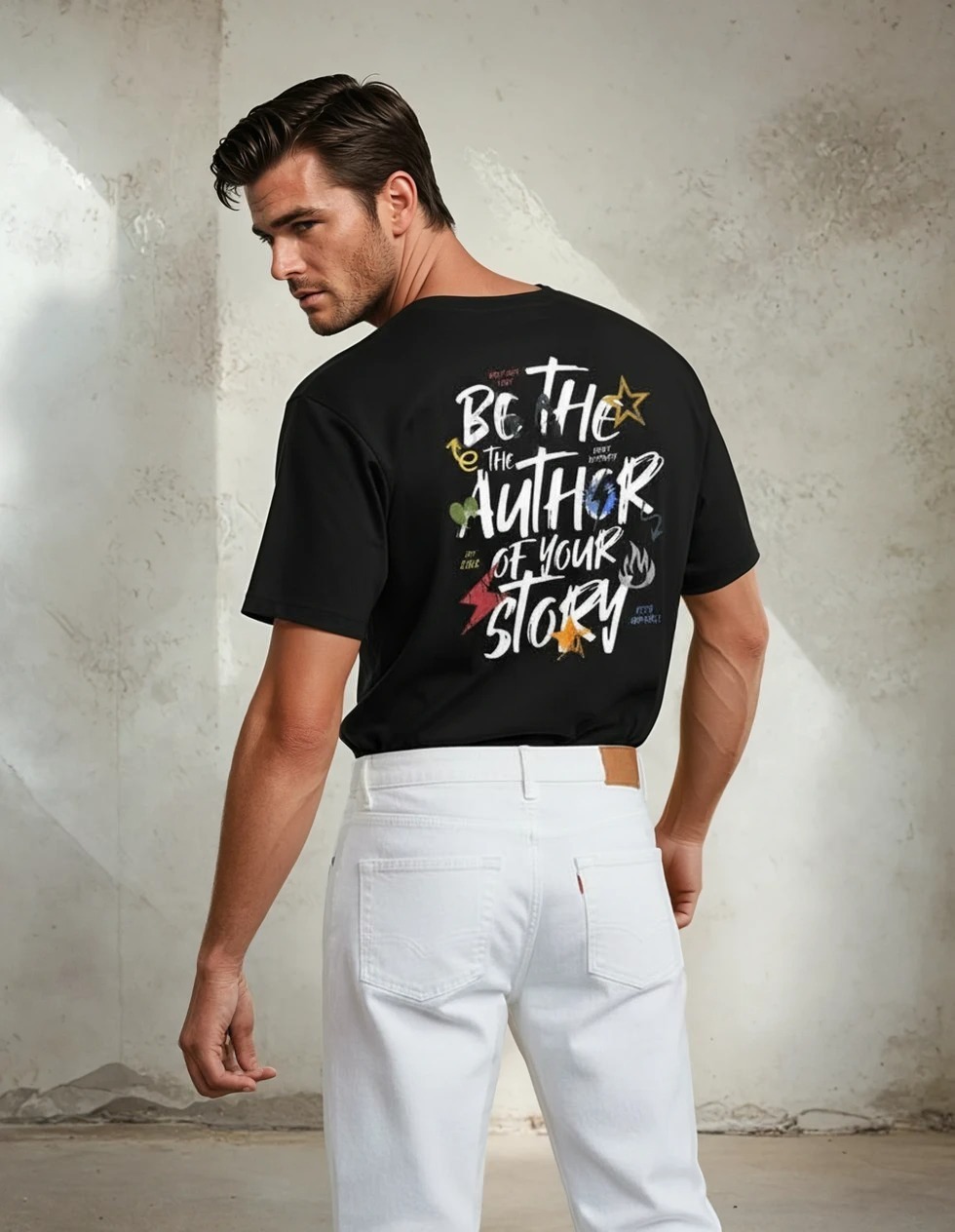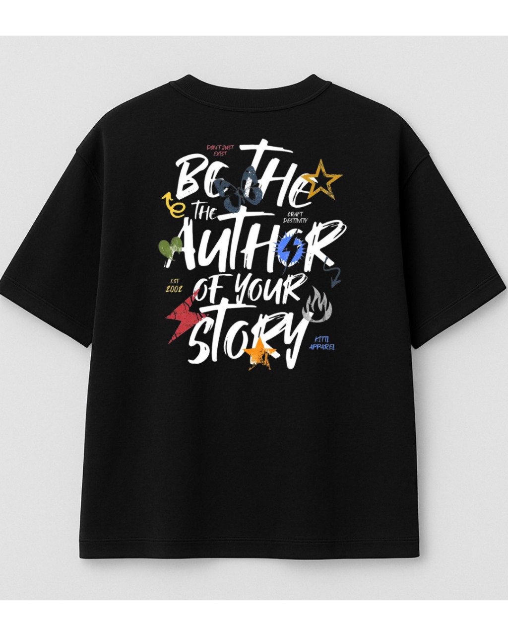 Black drop shoulder tee made of comfy cotton fabric. The design on the front says “Be The Author Of Your Story” in bold, playful white lettering, mixed with colorful graphics like stars, hearts, flames, and more. Small text details like “Point Out The Exit,” “Craft Destiny,” “EST. 2002,” and “MTM APPAREL” add extra flair. Perfect for making a statement! 😎