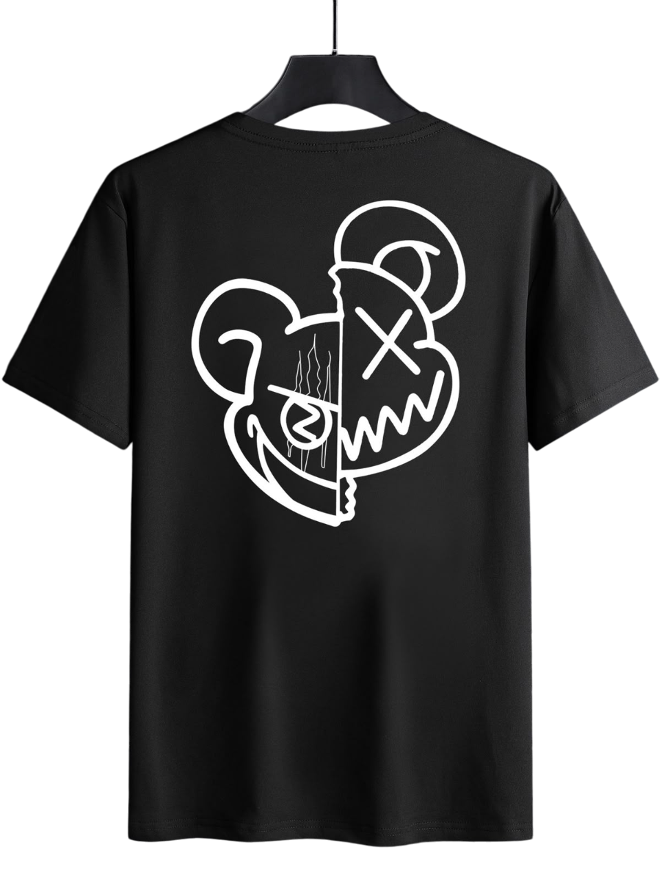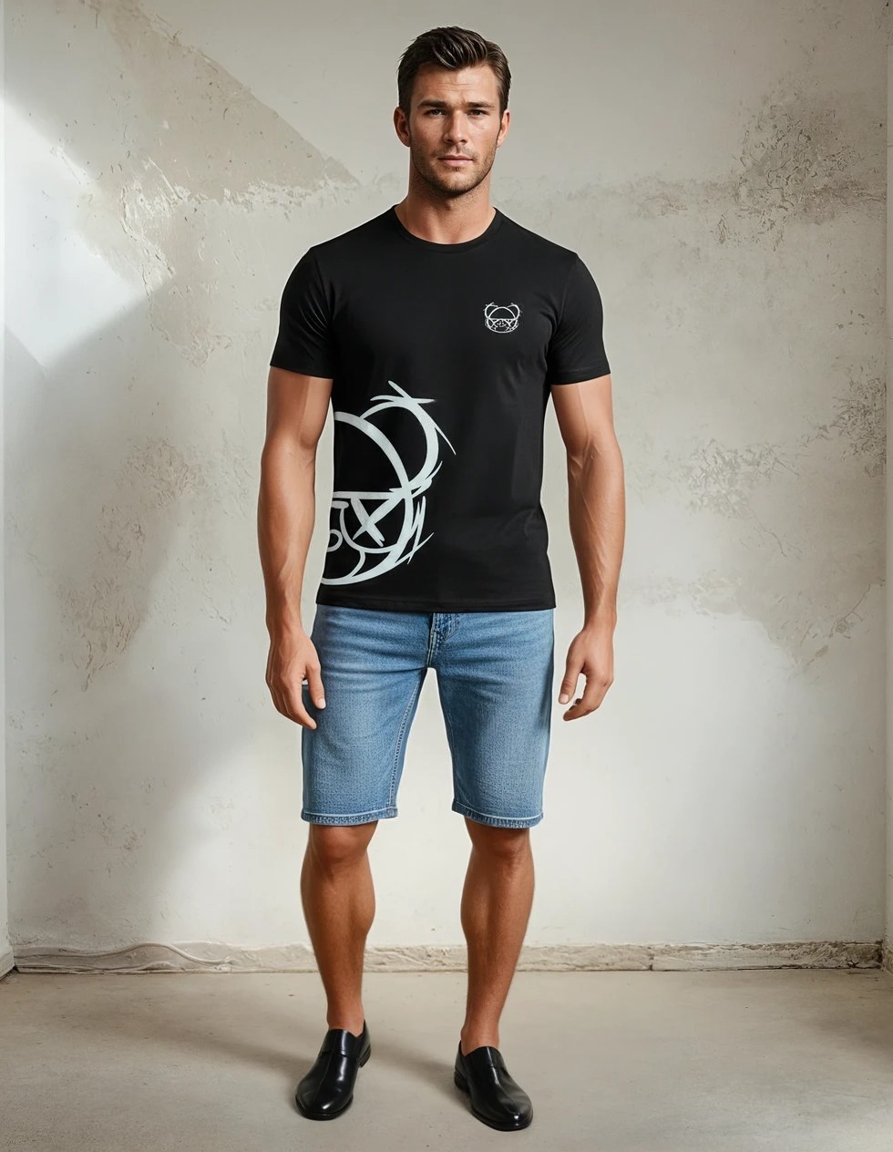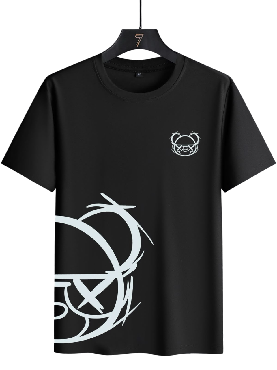 This stylish black tee features bold white graphic designs with X marks and dynamic lines. Made from 100% cotton for comfort and breathability. Perfect for casual wear with a touch of edgy graphics