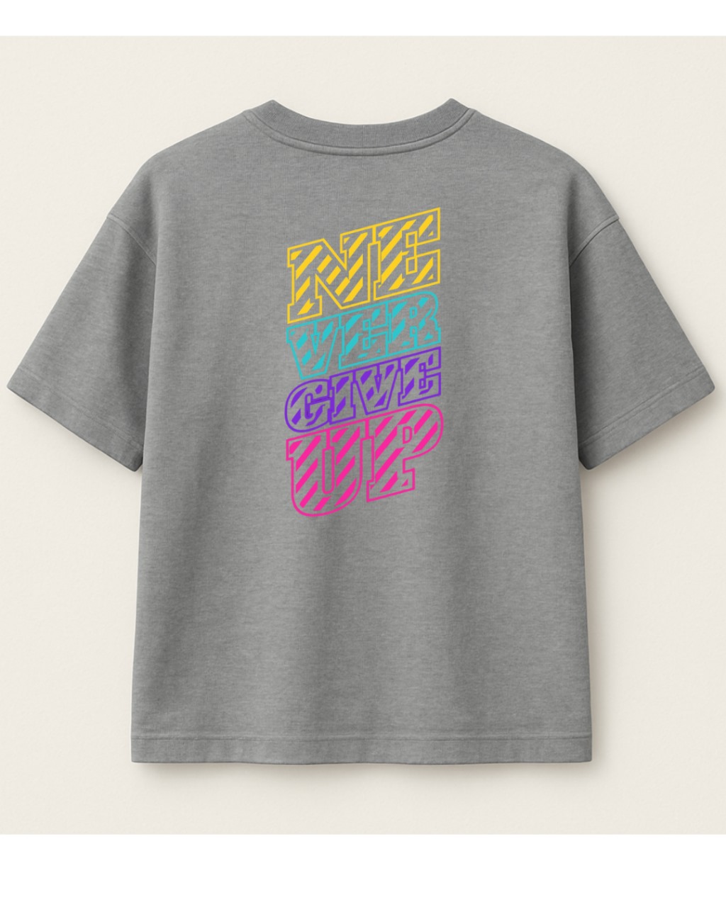 “Elevate your style with this motivational drop shoulder tee! Crafted from comfy cotton fabric, this gray shirt features a bold, stacked design with the empowering phrase ‘NEVER GIVE UP’ in vibrant colors – yellow, teal, purple, and pink. The unique drop shoulder cut adds a trendy touch to this casual yet inspiring piece. Perfect for everyday wear, this tee is a great way to spread positivity and showcase your style.”