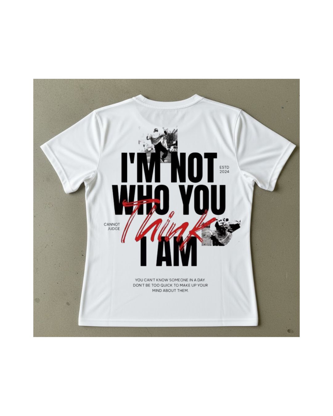 Make a statement with the MYSTERY TEE Dri-Fit Shirt! This sleek white tee features a bold design on the back with impactful typography that reads “I’M NOT WHO YOU Think I AM” in a mix of black and red fonts. The phrase “Think” is scribbled in red, adding a touch of edginess. Small text above and below the main phrase reads “CANNOT JUDGE” and “YOU CAN’T KNOW SOMEONE IN A DAY DON’T BE TOO QUICK TO MAKE UP YOUR MIND ABOUT THEM,” emphasizing the theme of not judging others quickly.