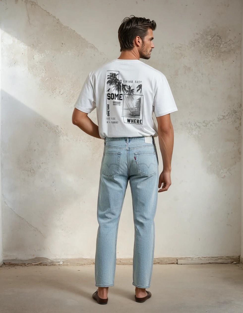 “Get ready to vibe with this chill drop shoulder tee! 😎 Crafted from comfy cotton fabric, this white shirt features a sick design with palm trees, a beach scene, and fun text like “LIVING EASY”, “SOME SOMETHING WHERE”, and “THIS PLACE IS A PARADISE”. With a laid-back drop shoulder fit, this tee’s perfect for those sunny days or just chillin’ out. Summer vibes in a shirt! ☀”