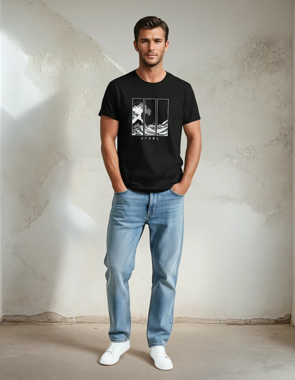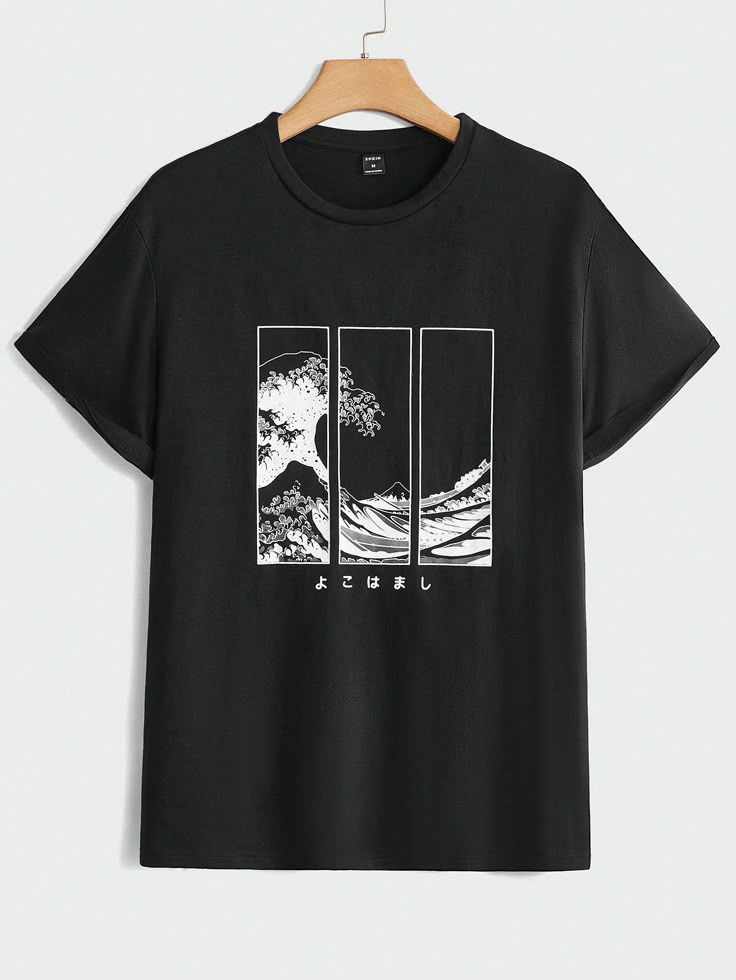 Rock this dope black DRI-FIT tee featuring a graphic design inspired by the iconic “The Great Wave off Kanagawa” by Hokusai! 🔥 The design showcases three panels of crashing waves with Mt. Fuji in the backdrop, all in crisp white graphics on a black tee. Below the waves, “よこはまし” (Yokohama shi) is written in Japanese script, adding a touch of cultural flair. 💡 Made with DRI-FIT fabric for ultimate comfort and breathability, this tee’s perfect for casual hangs or light workouts. Get yours now! 👕